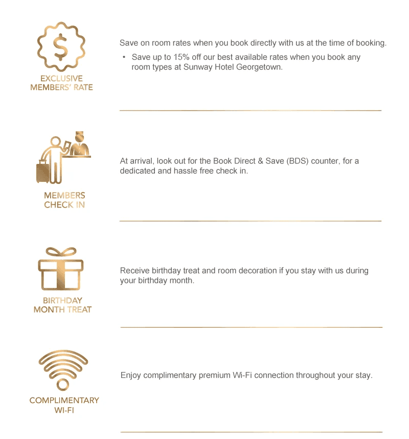 - All benefits and privileges listed are available exclusively for guests of Sunway Hotel Georgetown who book direct with us on https://www.sunwayhotels.com/sunway-georgetown
